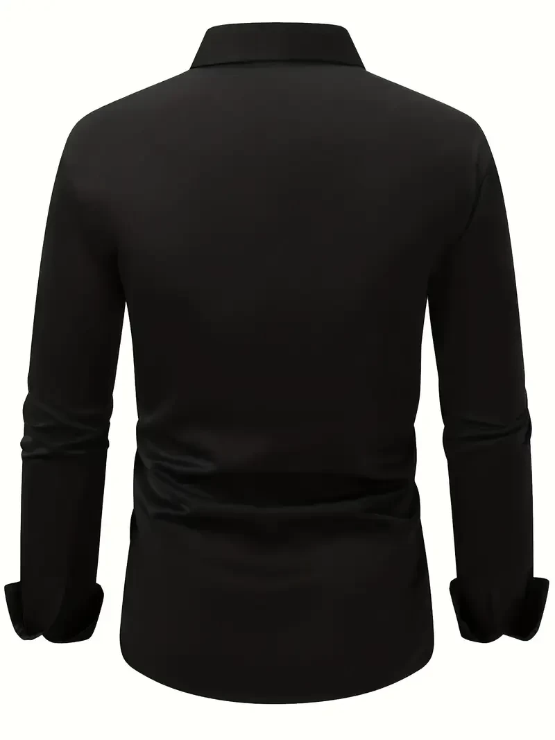 قميص رجالي كلاسيكي أسود بأكمام طويلة وأزرار - للارتداء اليومي والرسمي، قماش غير مطاطي، مثالي للأعمال أو المناسبات الاجتماعية، قميص أنيق بلون سادة لموسم السنة الجديدة، مظهر راقي